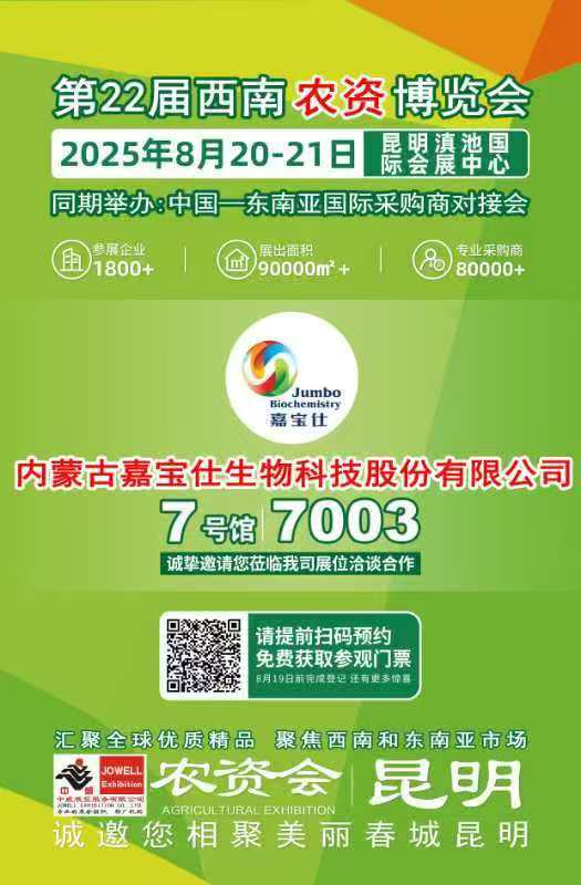 8月20 - 21日,第22届西南农资博览会将在昆明滇池国际会展中心盛大举行。此次盛会吸引了全球近1800家企业参展 ,展出面积近100000平方米,预计专业观众达100000人次,是农资行业一年一度的交流盛宴。内蒙古嘉宝仕生物科技股份有限公司作为行业内的高新技术企业与科技型中小企业,在销售总监的带领下强势参展,展示前沿产品与技术,积极拓展西南市场。
